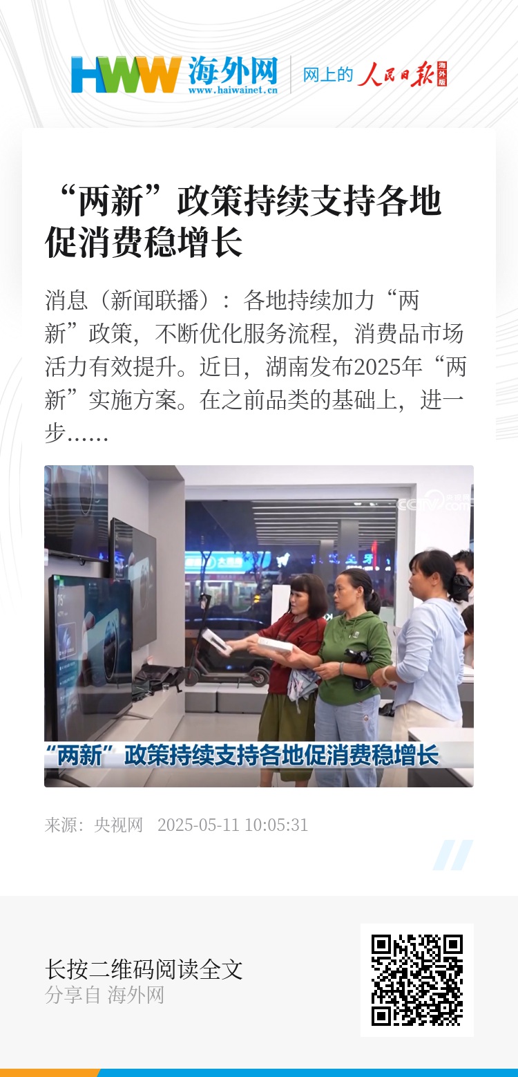 近日,湖南发布2025年“两新”实施方案。在之前品类的基础上,进一步从扩围拓品、提标降槛等五方面进行调整和优化。截至5月6日,全省消费品以旧换新共有458万多笔申领补贴,累计申领金额39.47亿元,带动销售金额超过306亿元,消费品市场活力进一步提升。陕西西安日前发布了当地首款国补金融产品——“国补贷”。这款产品额度高、利率低,申请国补的商户能简单、高效地获得高额度信贷资金,进一步减轻企业资金压力。今年,西安计划投入首批20亿元专项额度,定向支持国补商户。