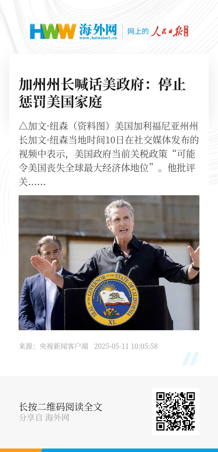 纽森同时发文说,“几个月后,人们会缺学校书包、缺节日玩具。关税将令美国家庭雪上加霜。”他向特朗普政府发出明确的信息:停止惩罚美国家庭。
