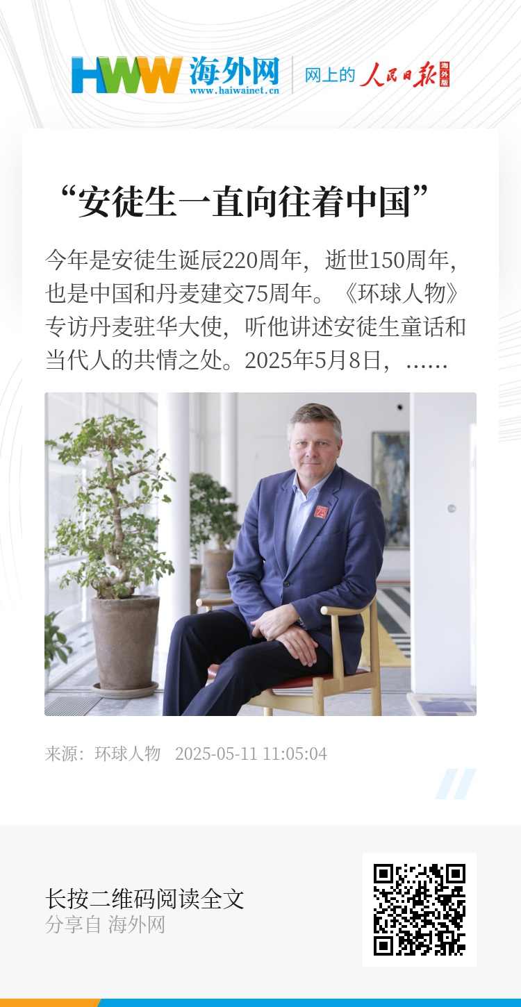 我也希望,有朝一日能在中国做一次演讲,通过讲述安徒生的中国缘,进一步促进两国的文化交流。虽然我还没有做过这样的演讲,但我期待着分享相关内容,用安徒生童话架起丹中友谊的桥梁。(环球人物记者 冯璐 刘玉婷)