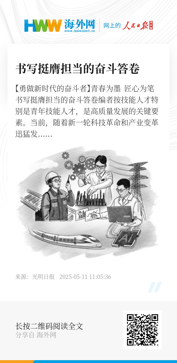 技能人才特别是青年技能人才,是高质量发展的关键要素。当前,随着新一轮科技革命和产业变革迅猛发展,越来越多的青年技能人才在技能成才、技能报国的路上绽放光彩。