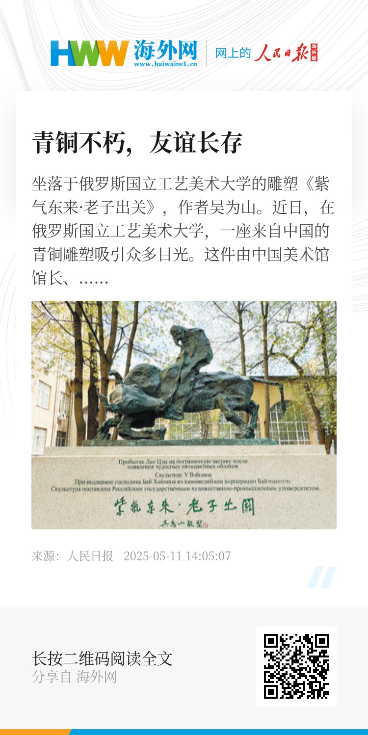 近日,在俄罗斯国立工艺美术大学,一座来自中国的青铜雕塑吸引众多目光。这件由中国美术馆馆长、雕塑家吴为山精心创作的《紫气东来·老子出关》,是莫斯科首座以中国传统文化思想为主题的大型雕塑,也是“中俄文化年”系列人文交流活动的重要成果。它跨越山海,带着东方智慧的祥瑞之气,在域外的学术殿堂生根。