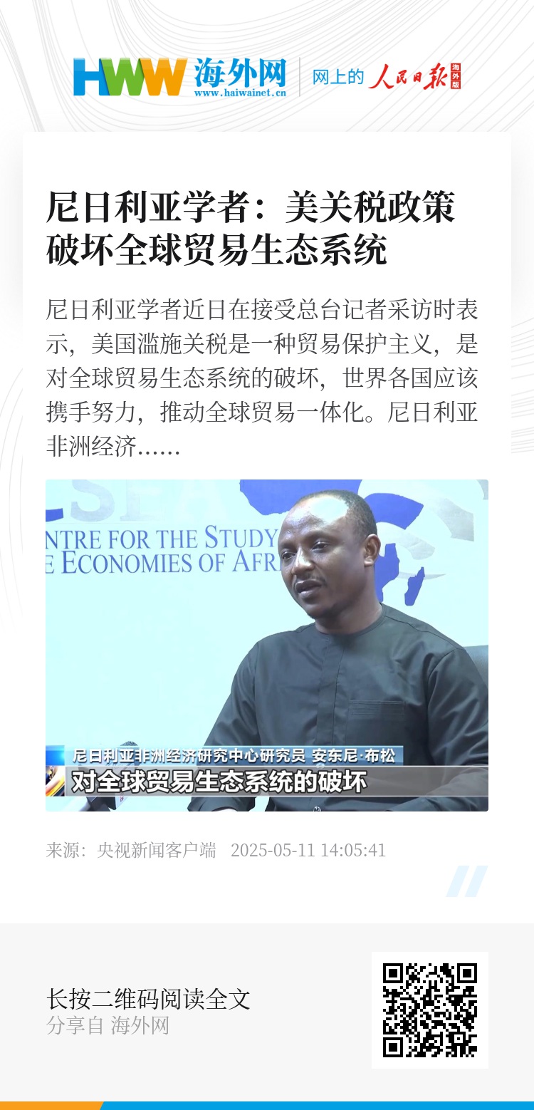 尼日利亚学者近日在接受总台记者采访时表示,美国滥施关税是一种贸易保护主义,是对全球贸易生态系统的破坏,世界各国应该携手努力,推动全球贸易一体化。