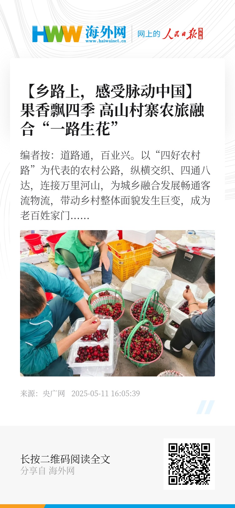 央广网成都5月10日消息(记者 昌思荣 王颖)初夏时分,万物蓬勃生长。从山脚入口处出发,驾车沿着平坦的柏油路盘山而上,大约20分钟便来到了理县桃坪镇佳山村。红彤彤的小樱桃正值丰收,漫山的车厘子也陆续成熟,不少游客已经按捺不住,纷纷赶来“尝鲜”。