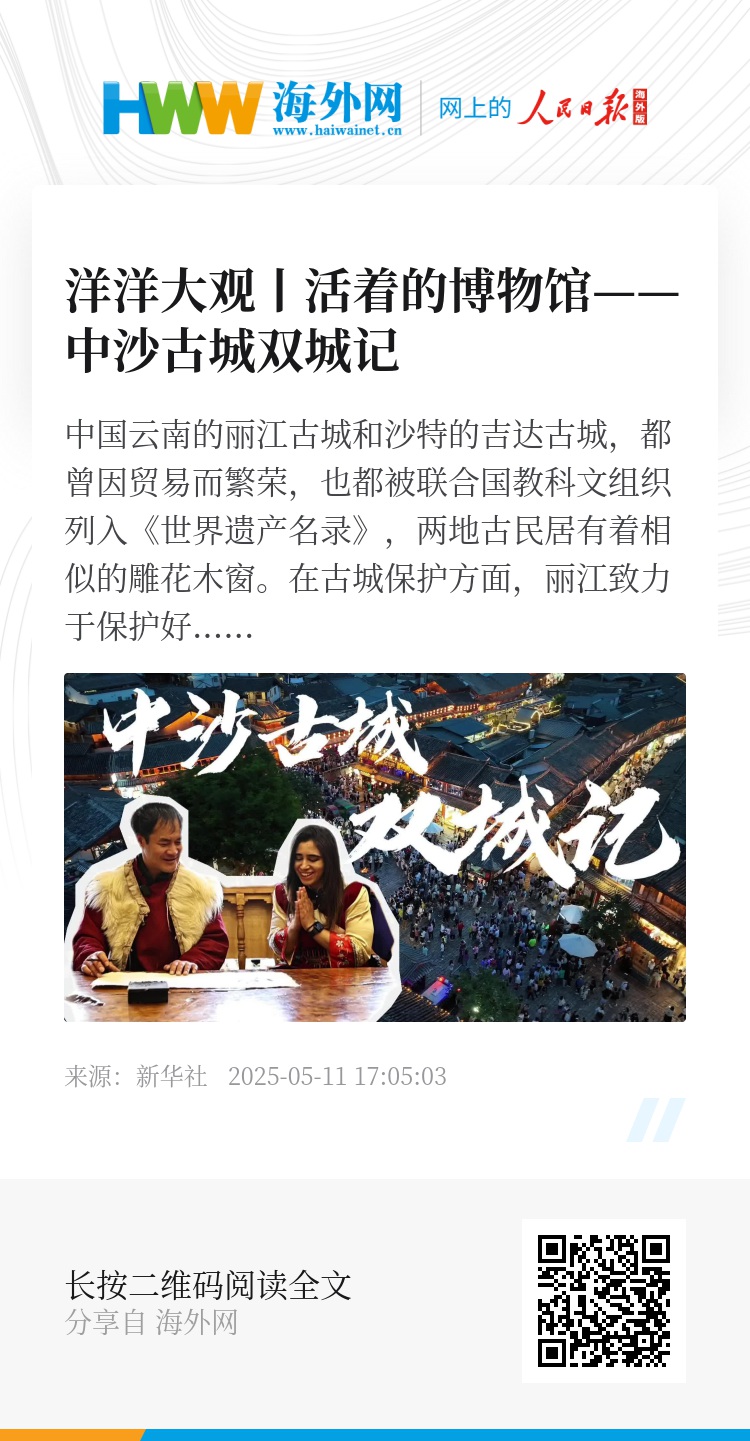 中国云南的丽江古城和沙特的吉达古城,都曾因贸易而繁荣,也都被联合国教科文组织列入《世界遗产名录》,两地古民居有着相似的雕花木窗。