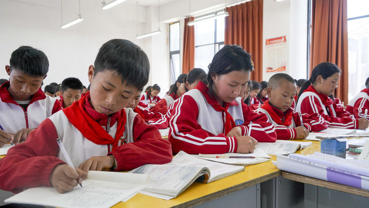 四川省昭觉县城北镇沐恩邸中心小学学生在课堂上写作业(2025年4月21日摄)。新华社记者 尹恒 摄