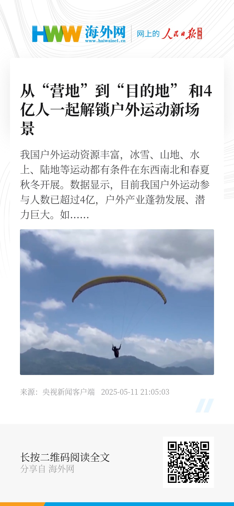 我国户外运动资源丰富,冰雪、山地、水上、陆地等运动都有条件在东西南北和春夏秋冬开展。数据显示,目前我国户外运动参与人数已超过4亿,户外产业蓬勃发展、潜力巨大。