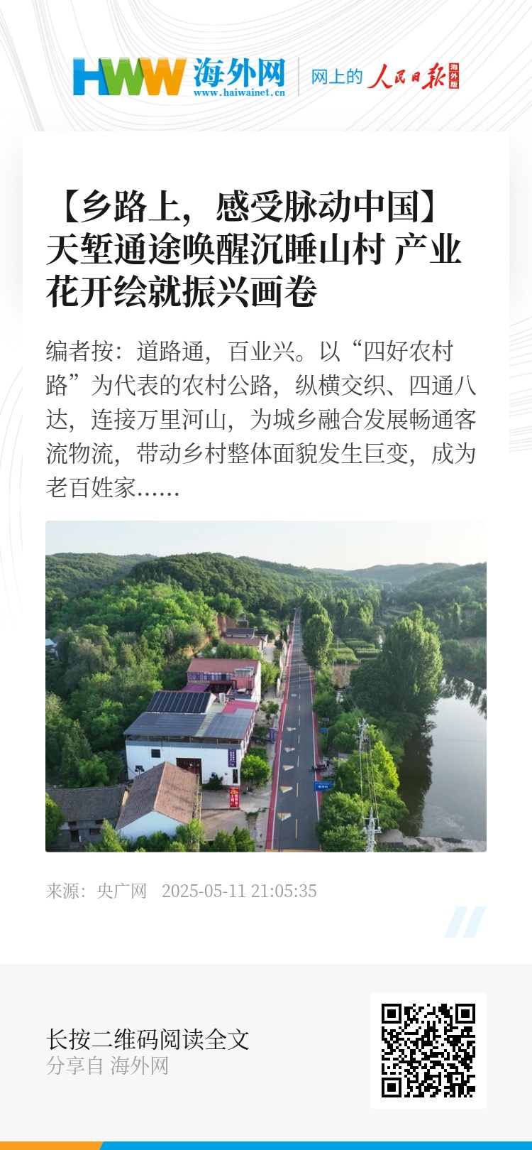 编者按:道路通,百业兴。以“四好农村路”为代表的农村公路,纵横交织、四通八达,连接万里河山,为城乡融合发展畅通客流物流,带动乡村整体面貌发生巨变,成为老百姓家门口的致富路、幸福路、振兴路。央广网特别推出《乡路上,感受脉动中国》系列报道,沿着“四好农村路”,访村落、进田园、看产业,探寻乡土文脉,纵观发展变迁,与您一起感受新时代中国乡村振兴的勃勃生机。