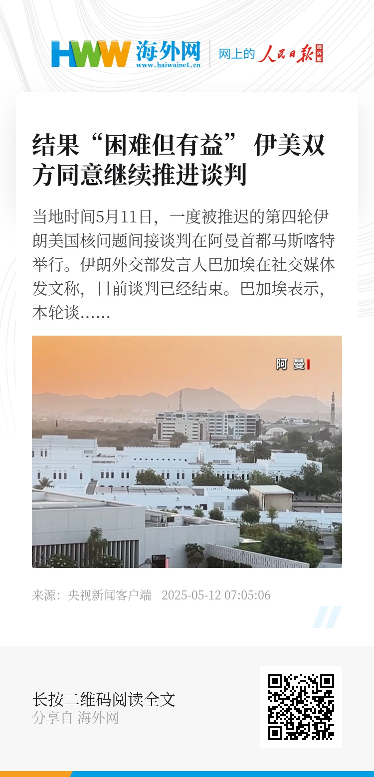 当地时间5月11日,一度被推迟的第四轮伊朗美国核问题间接谈判在阿曼首都马斯喀特举行。伊朗外交部发言人巴加埃在社交媒体发文称,目前谈判已经结束。巴加埃表示,本轮谈判“艰难但有益”。下一轮谈判的时间和地点将由阿曼宣布。
