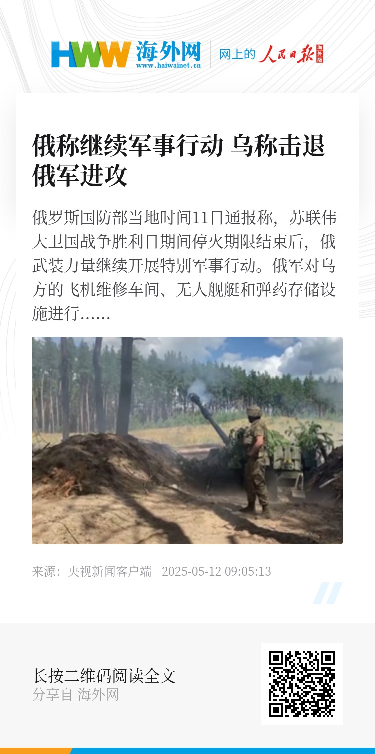 俄罗斯国防部当地时间11日通报称,苏联伟大卫国战争胜利日期间停火期限结束后,俄武装力量继续开展特别军事行动。俄军对乌方的飞机维修车间、无人舰艇和弹药存储设施进行了打击。在不同战线打死打伤上千名乌方人员。俄军防空系统击落多枚制导航空炸弹和143架无人机。