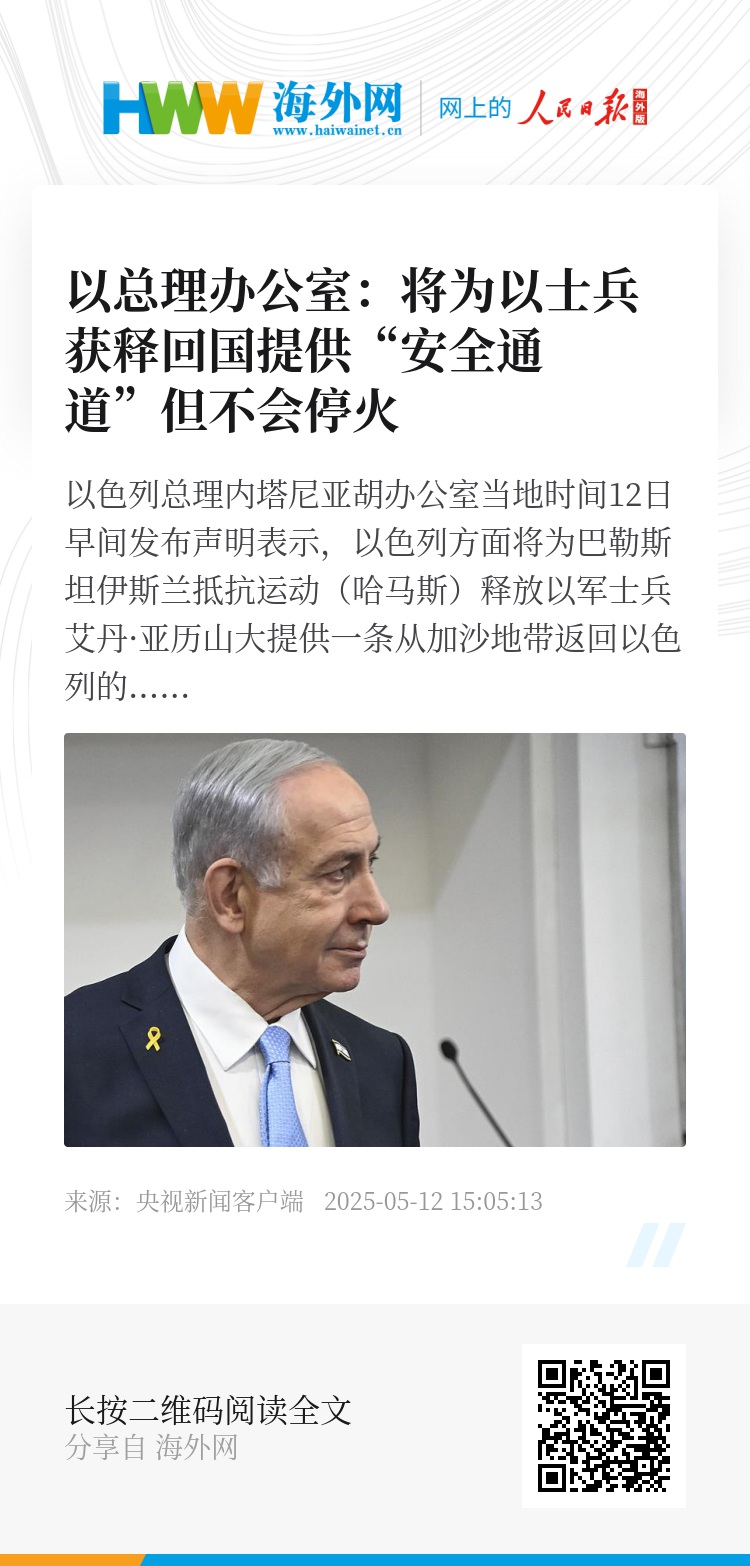 以色列总理内塔尼亚胡办公室当地时间12日早间发布声明表示,以色列方面将为巴勒斯坦伊斯兰抵抗运动(哈马斯)释放以军士兵艾丹·亚历山大提供一条从加沙地带返回以色列的“安全通道”,但不会承诺在加沙实施停火或释放巴勒斯坦囚犯。