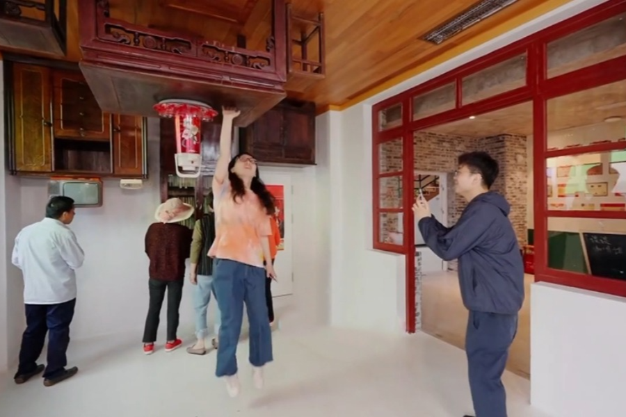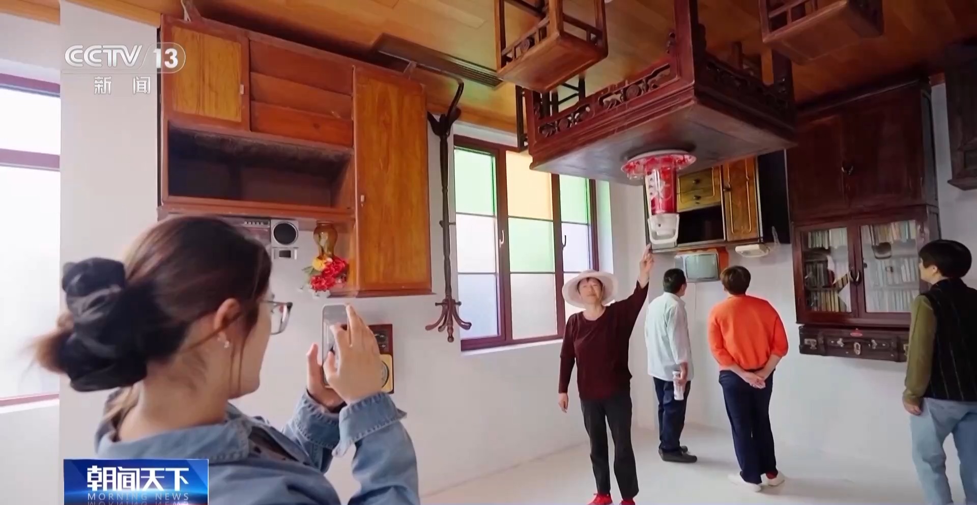 在乡村博物馆的“倒立屋”前,一批批游客和新农人正兴奋地摆出腾空姿势。谈村“倒立屋”经过建筑师的巧妙设计,沙发悬顶、吊灯“长”在地面,穿越感满满。