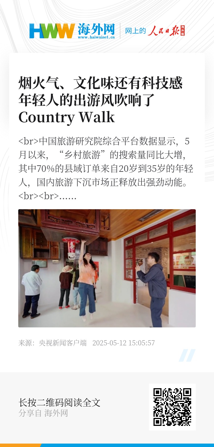 中国旅游研究院综合平台数据显示,5月以来,“乡村旅游”的搜索量同比大增,其中70%的县域订单来自20岁到35岁的年轻人,国内旅游下沉市场正释放出强劲动能。