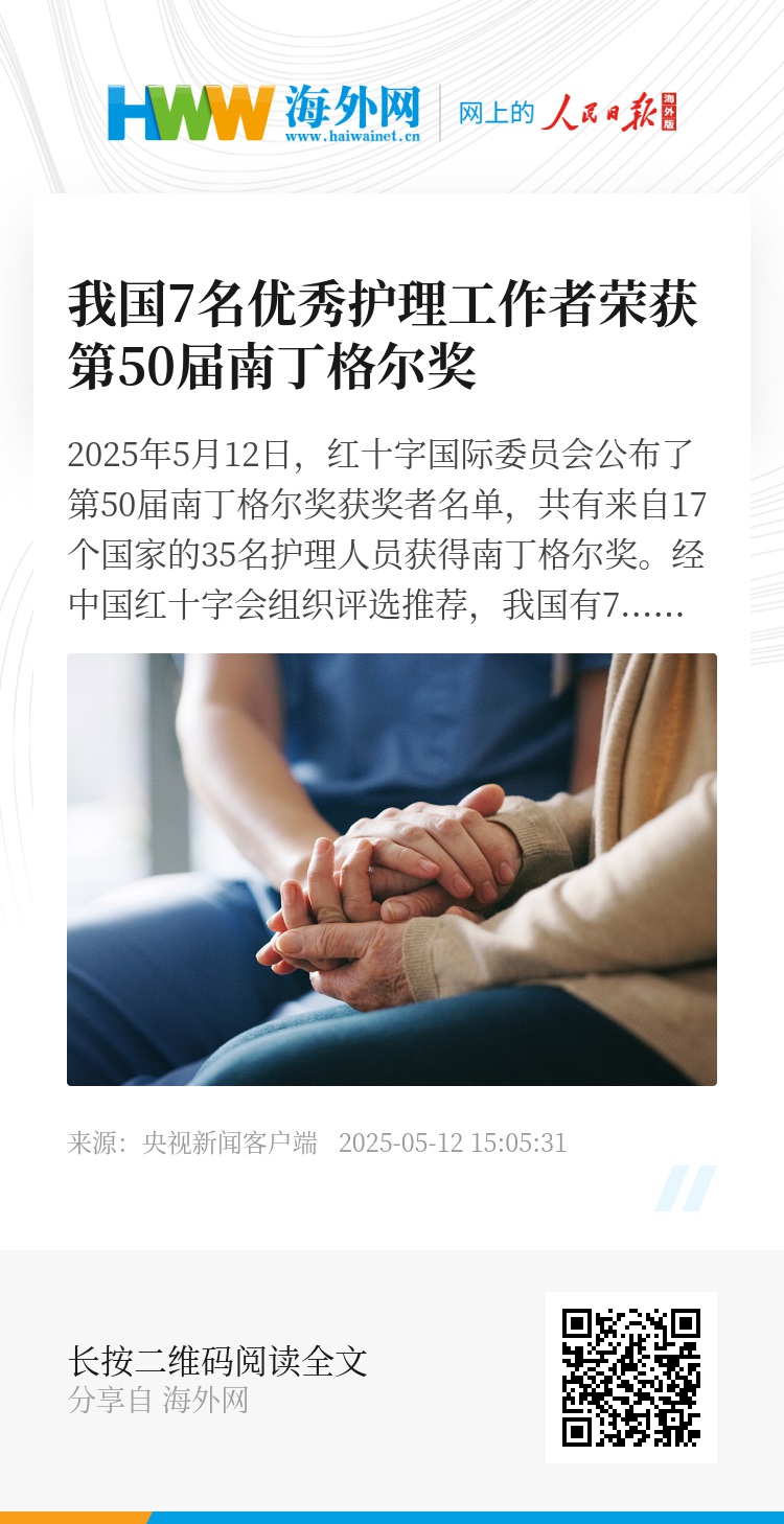 2025年5月12日,红十字国际委员会公布了第50届南丁格尔奖获奖者名单,共有来自17个国家的35名护理人员获得南丁格尔奖。经中国红十字会组织评选推荐,我国有7名优秀护理工作者获此殊荣,是本届获奖人数最多的国家。