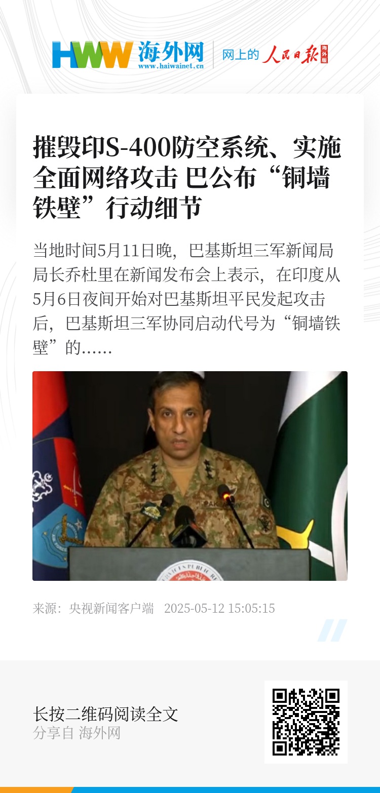 巴方此次公布的“铜墙铁壁”行动细节中,谈及的摧毁印军S-400防空系统相关内容,此前印方曾有过回应。10日,印度外交部和军方举行联合发布会。印度军方发言人表示,巴基斯坦试图持续进行恶意的虚假信息宣传,声称印度S-400防空系统被摧毁以及苏拉特和锡尔萨的机场被摧毁,对此,印度明确予以否认,此类消息均为假消息。(总台记者 崔如)