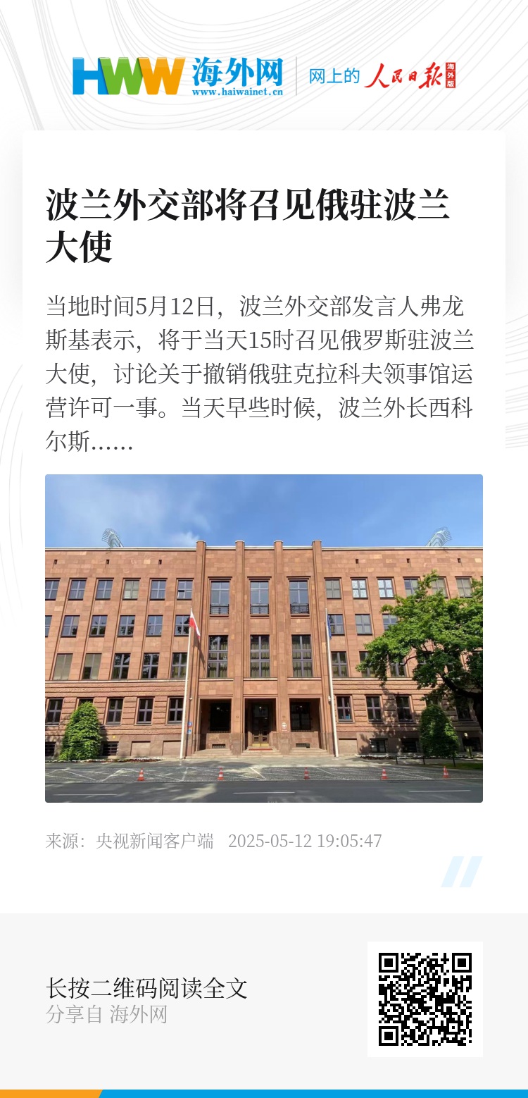 当地时间5月12日,波兰外交部发言人弗龙斯基表示,将于当天15时召见俄罗斯驻波兰大使,讨论关于撤销俄驻克拉科夫领事馆运营许可一事。
