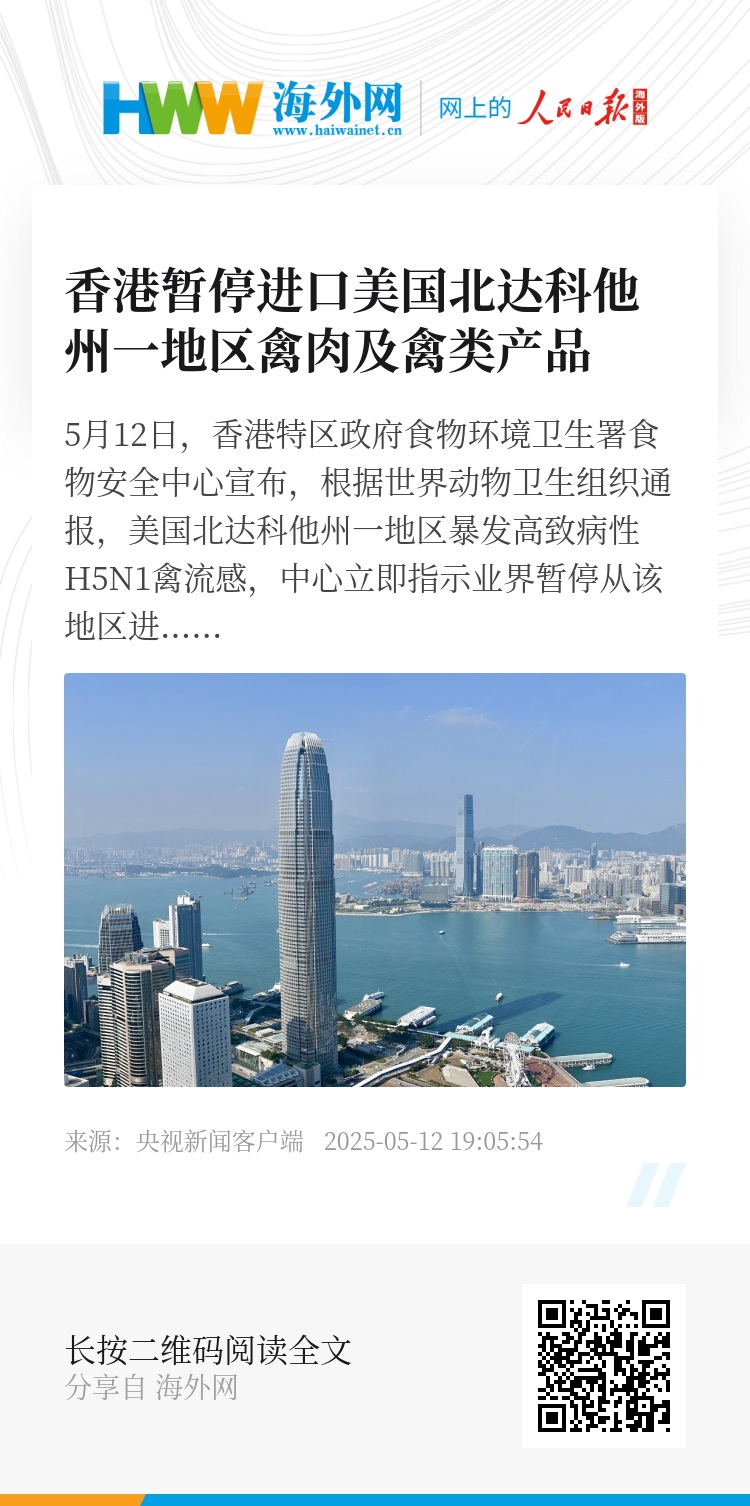 5月12日,香港特区政府食物环境卫生署食物安全中心宣布,根据世界动物卫生组织通报,美国北达科他州一地区暴发高致病性H5N1禽流感,中心立即指示业界暂停从该地区进口禽肉及禽类产品(包括禽蛋),以保障香港公众健康。