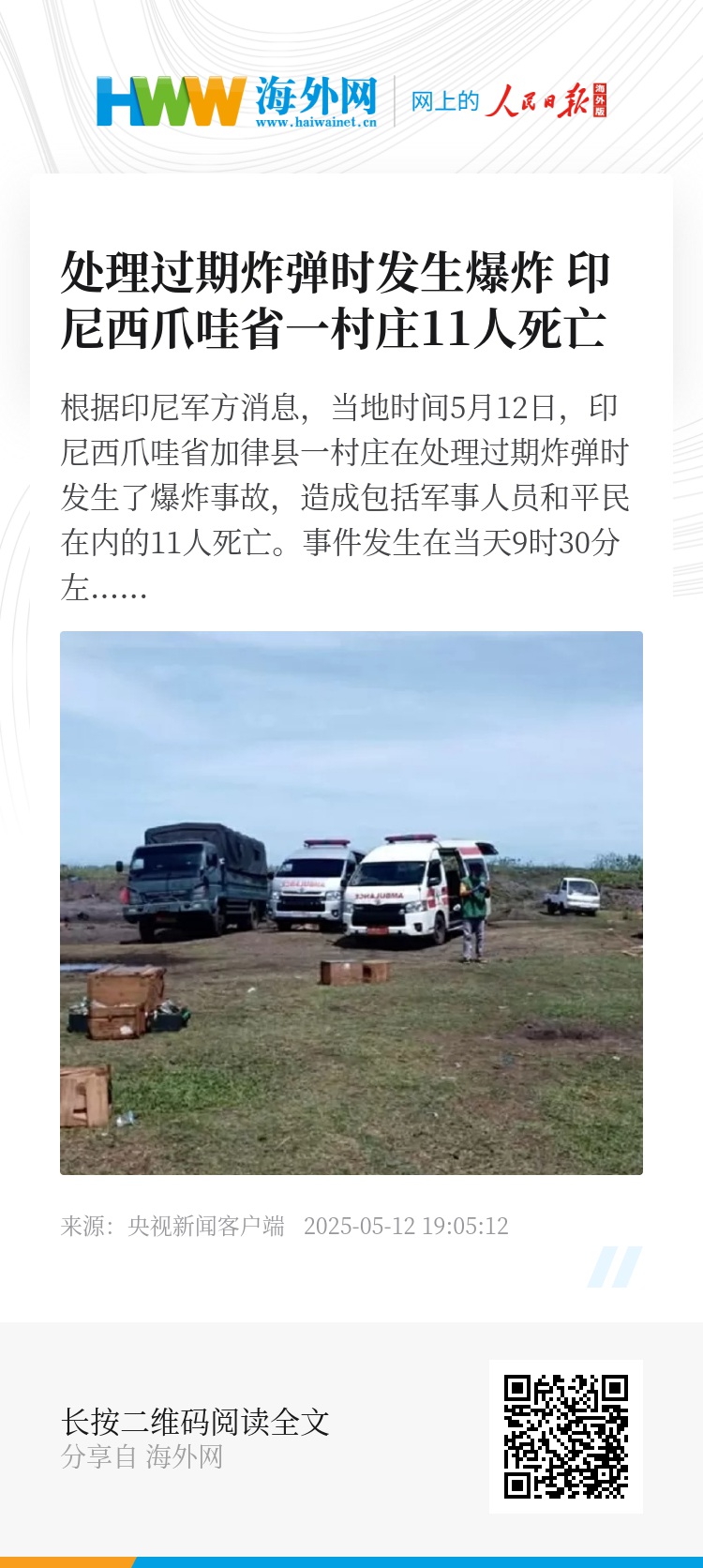根据印尼军方消息,当地时间5月12日,印尼西爪哇省加律县一村庄在处理过期炸弹时发生了爆炸事故,造成包括军事人员和平民在内的11人死亡。