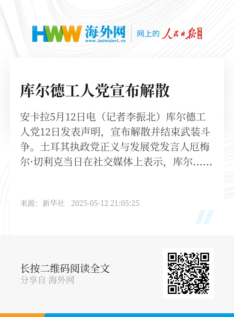 新华社安卡拉5月12日电(记者李振北)库尔德工人党12日发表声明,宣布解散并结束武装斗争。