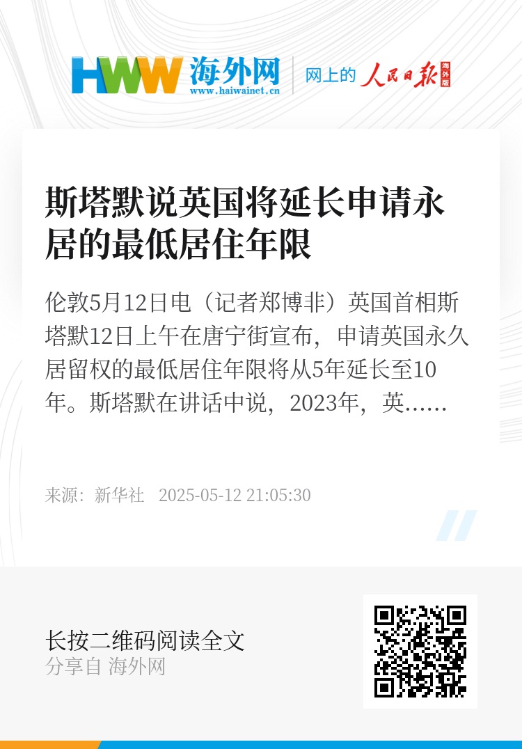 新华社伦敦5月12日电(记者郑博非)英国首相斯塔默12日上午在唐宁街宣布,申请英国永久居留权的最低居住年限将从5年延长至10年。