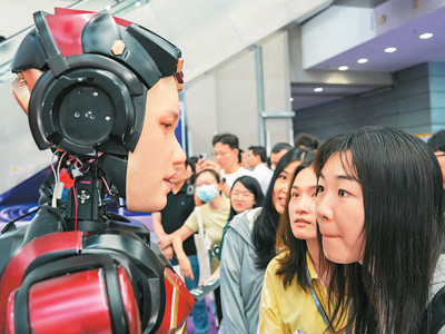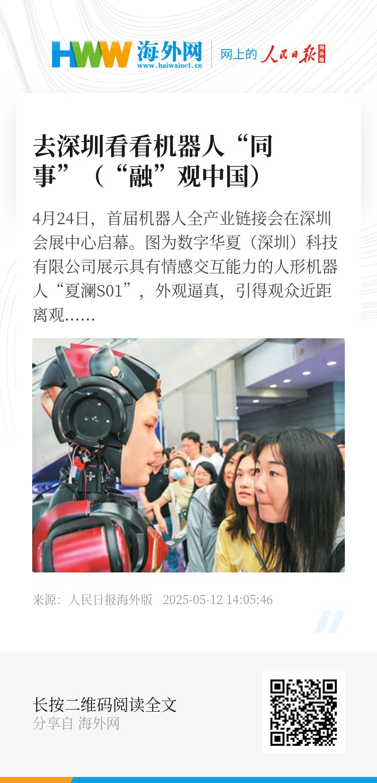 4月24日,首届机器人全产业链接会在深圳会展中心启幕。图为数字华夏(深圳)科技有限公司展示具有情感交互能力的人形机器人“夏澜S01”,外观逼真,引得观众近距离观察。朱洪波摄