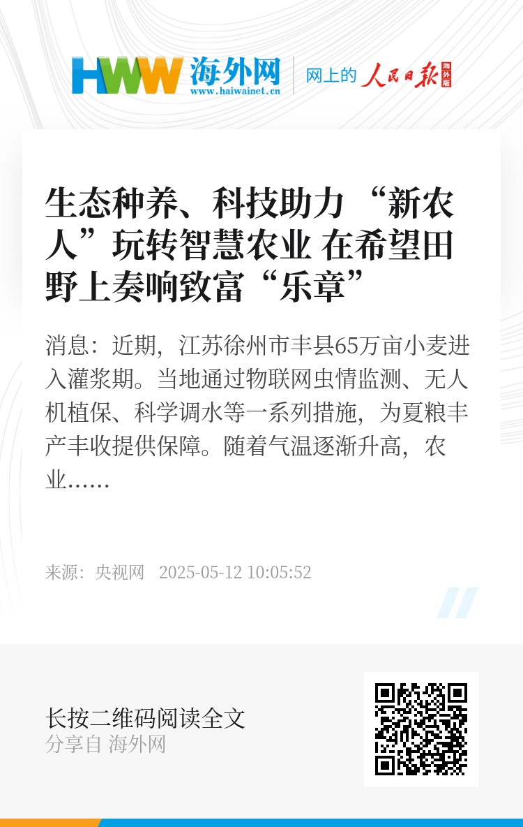 央视网消息:近期,江苏徐州市丰县65万亩小麦进入灌浆期。当地通过物联网虫情监测、无人机植保、科学调水等一系列措施,为夏粮丰产丰收提供保障。