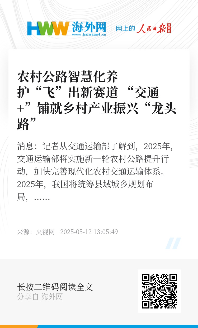 此外,2025年,交通运输部还将推动农村公路数字化转型,开展农村公路“一路一档”信息化建设,推进农村公路路况自动化检测。