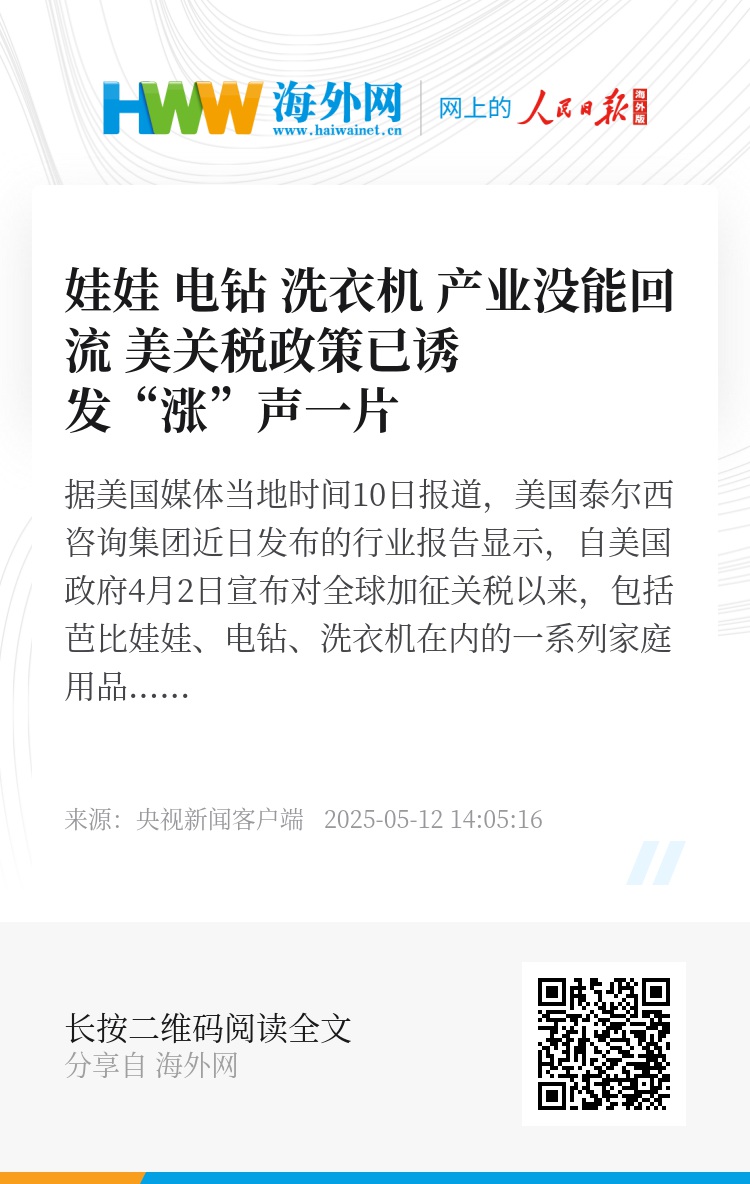 据美国媒体当地时间10日报道,美国泰尔西咨询集团近日发布的行业报告显示,自美国政府4月2日宣布对全球加征关税以来,包括芭比娃娃、电钻、洗衣机在内的一系列家庭用品的价格大涨。