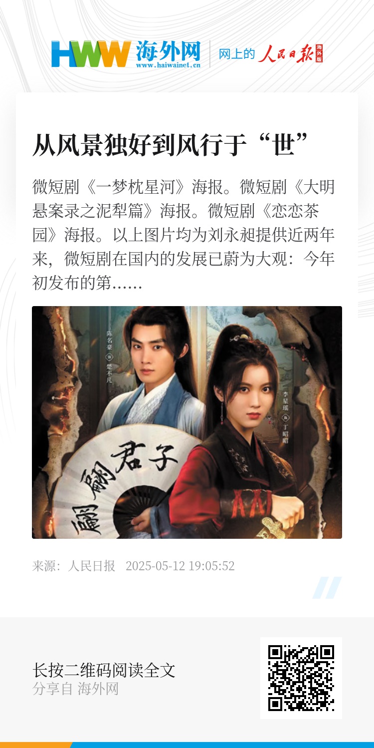 近两年来,微短剧在国内的发展已蔚为大观:今年初发布的第五十五次《中国互联网络发展状况统计报告》指出,国内微短剧用户已有6.62亿。与之相呼应,扬帆出海的微短剧也开始风行于“世”。究其原因,微短剧源于日常、面向大众,为人们喜闻乐见,同时其生产速度快、题材覆盖面广,作品供给源源不断。无论是来自中国的专业微短剧平台、国内外的大型流媒体平台,还是国际超级短视频平台,都为微短剧出海铺就立体多元的通道。人们期待全球旅行的微短剧,能顺应国内影视创作精品化的发展趋势,积“微”成著,讲述更多精彩纷呈的中国故事。