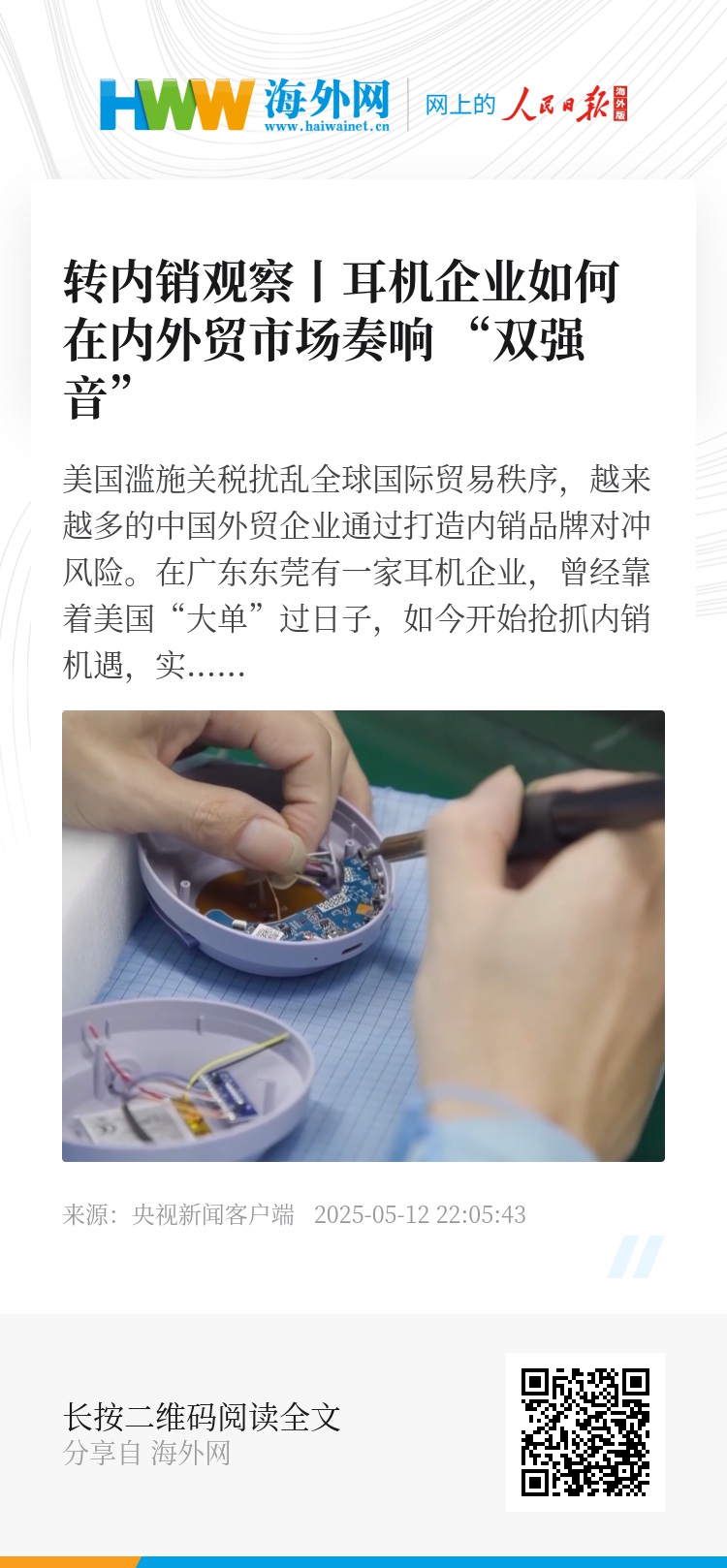 美国滥施关税扰乱全球国际贸易秩序,越来越多的中国外贸企业通过打造内销品牌对冲风险。在广东东莞有一家耳机企业,曾经靠着美国“大单”过日子,如今开始抢抓内销机遇,实现从“单腿跳”到“两条腿走路”的转型升级。