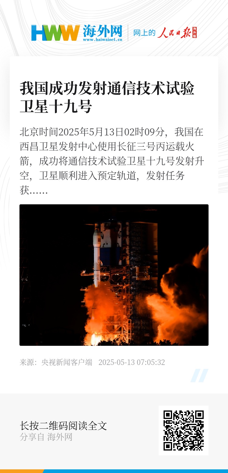 北京时间2025年5月13日02时09分,我国在西昌卫星发射中心使用长征三号丙运载火箭,成功将通信技术试验卫星十九号发射升空,卫星顺利进入预定轨道,发射任务获得圆满成功。该卫星主要用于开展多频段、高速率卫星通信技术验证。