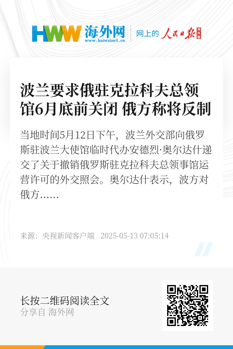 奥尔达什对媒体表示,在与波兰外交部官员的会面中,他被告知俄驻克拉科夫总领馆须在6月30日前关闭,“这是波兰方面的选择。两国关系本就不佳,波方现在决定让这种关系进一步恶化,这不是我们的决定”。