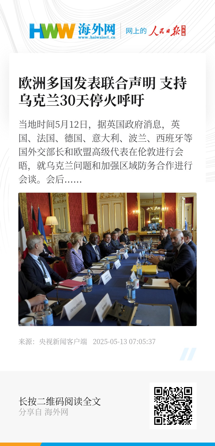 会后,与会国发布联合声明称,“与会各国将与乌克兰一道,呼吁立即、全面、无条件地停火30天,为关于公正、全面和持久和平的谈判创造空间。”(总台记者 杨兢兢)