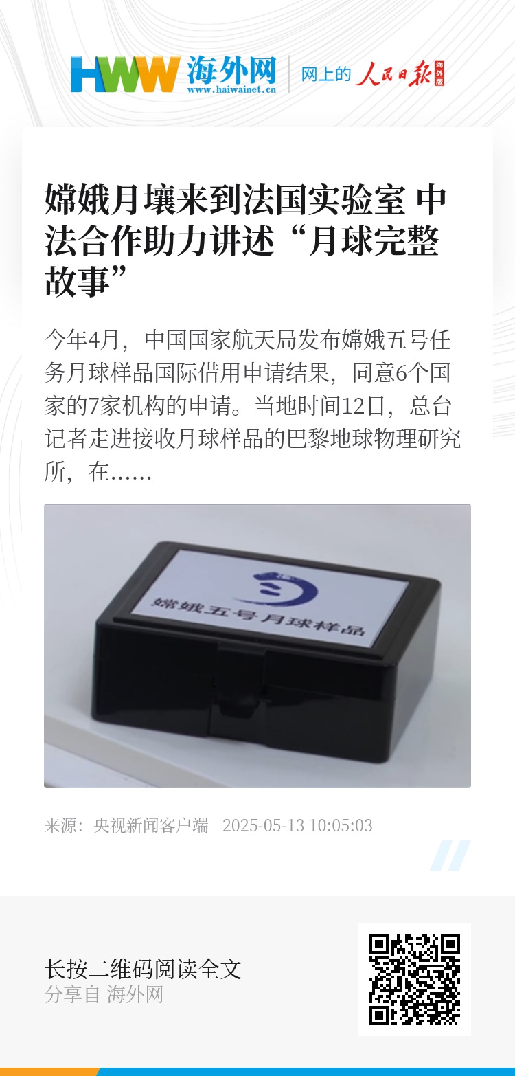 今年4月,中国国家航天局发布嫦娥五号任务月球样品国际借用申请结果,同意6个国家的7家机构的申请。当地时间12日,总台记者走进接收月球样品的巴黎地球物理研究所,在这里,月球样品引燃了法国科学家的研究热情。