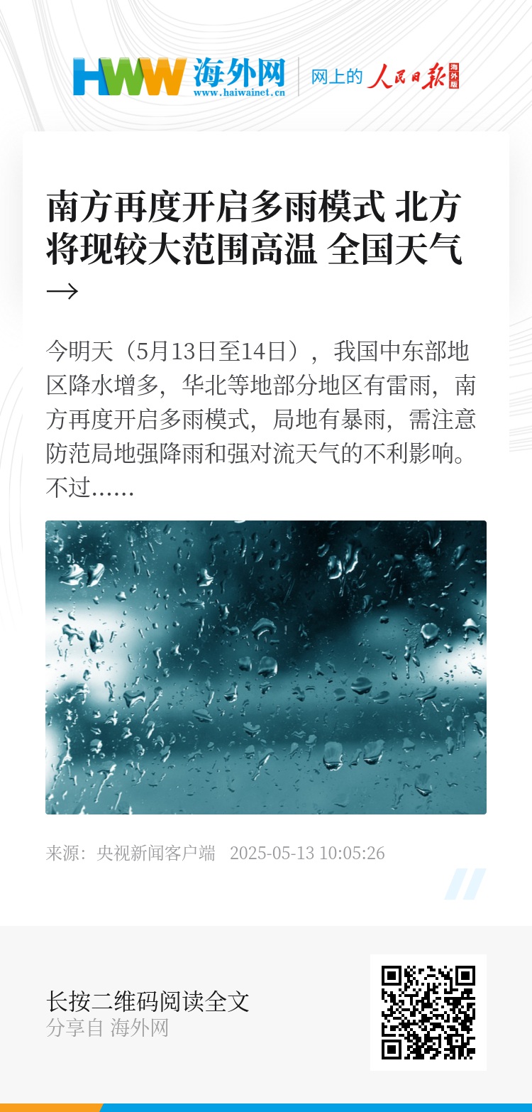今明天(5月13日至14日),我国中东部地区降水增多,华北等地部分地区有雷雨,南方再度开启多雨模式,局地有暴雨,需注意防范局地强降雨和强对流天气的不利影响。不过,北方短暂阴雨难阻升温势头,本周华北、黄淮等地部分地区多高温天气,16至17日高温范围较大,局地可达37℃以上,需注意防暑。