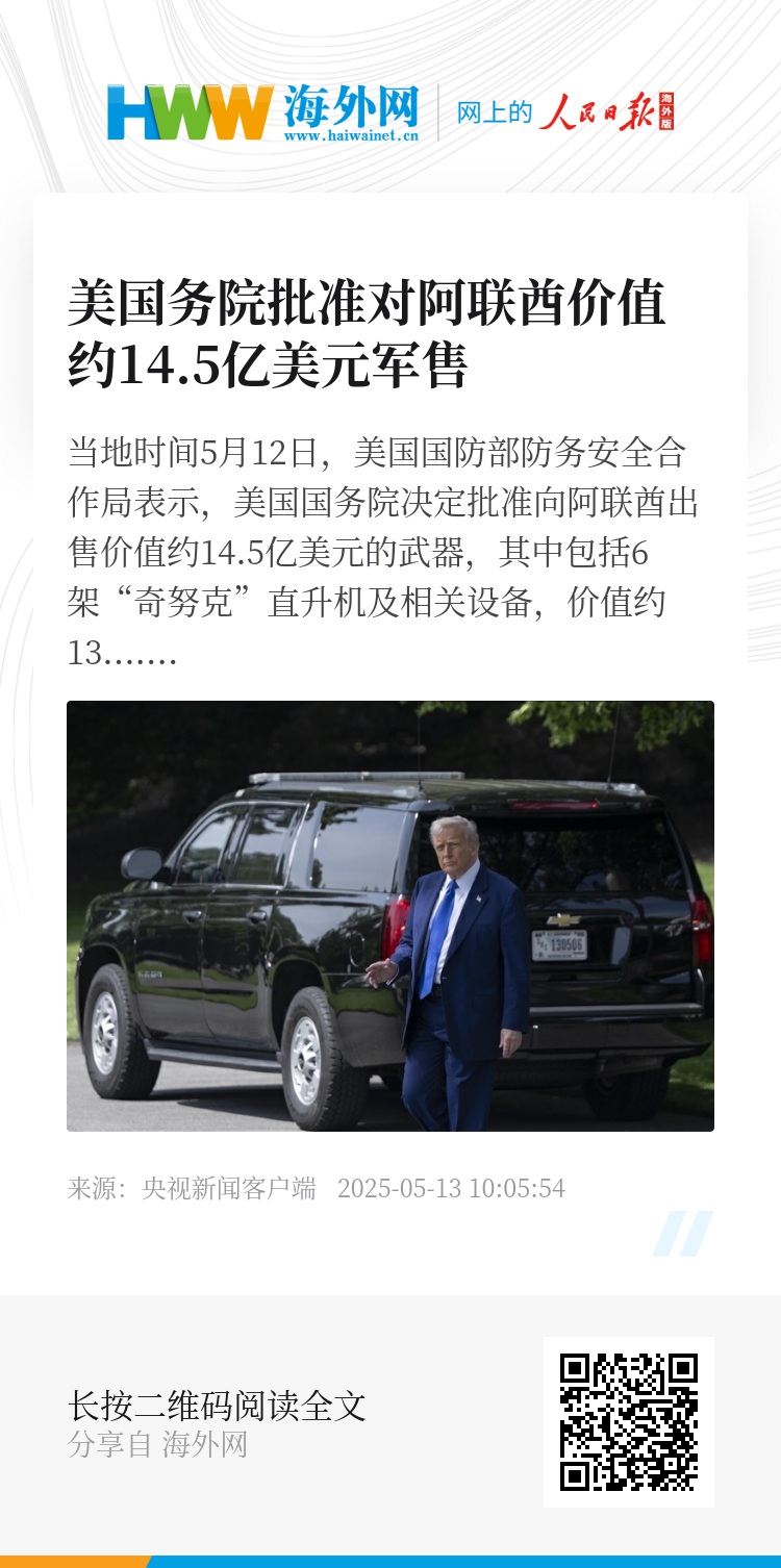 据悉,美国总统特朗普将于本周晚些时候访问阿联酋。阿联酋此前已承诺在未来10年内向美国投资1.4万亿美元。(总台记者 赵淼)