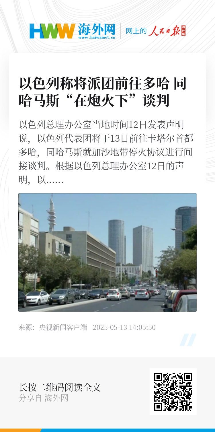 以色列总理办公室当地时间12日发表声明说,以色列代表团将于13日前往卡塔尔首都多哈,同哈马斯就加沙地带停火协议进行间接谈判。