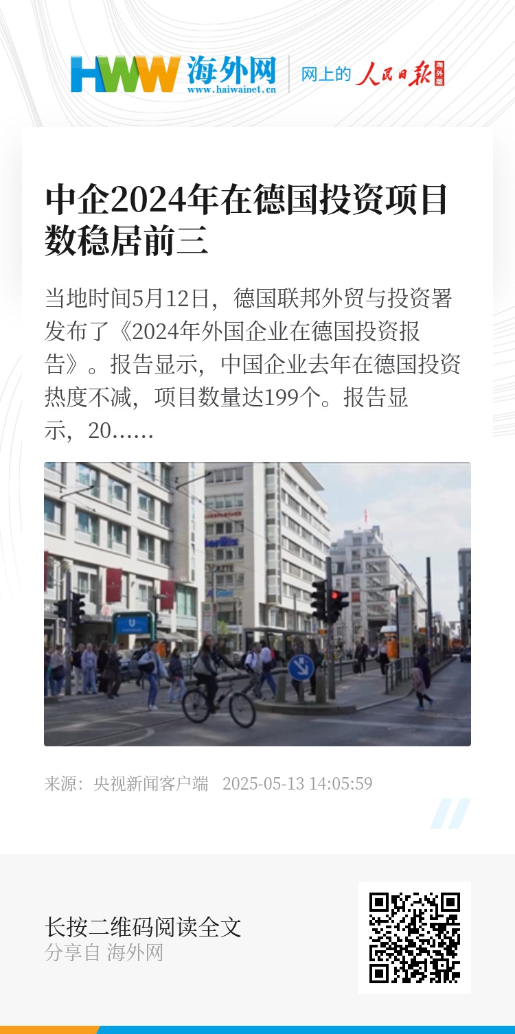 当地时间5月12日,德国联邦外贸与投资署发布了《2024年外国企业在德国投资报告》。报告显示,中国企业去年在德国投资热度不减,项目数量达199个。