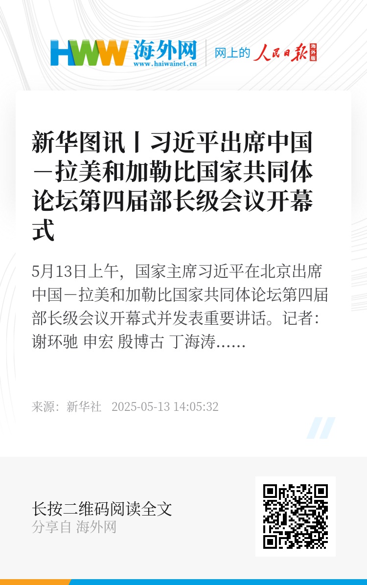 5月13日上午,国家主席习近平在北京出席中国-拉美和加勒比国家共同体论坛第四届部长级会议开幕式并发表重要讲话。