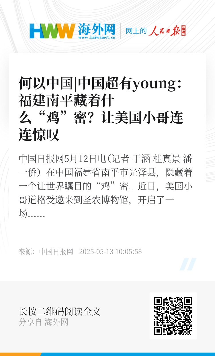 中国日报网5月12日电(记者 于涵 桂真景 潘一侨)在中国福建省南平市光泽县,隐藏着一个让世界瞩目的“鸡”密。