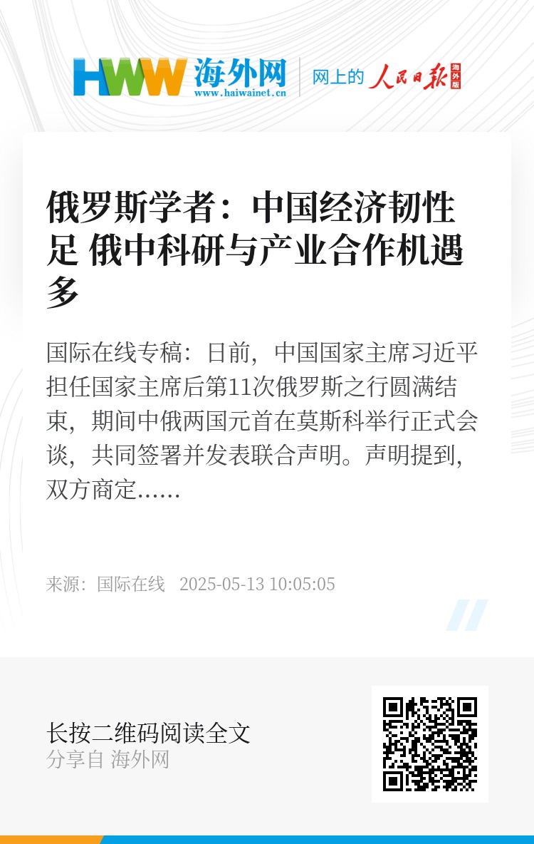 “中国宏大的国内消费市场是抵御外部冲击的强大缓冲器。”邦达连科指出,随着国民收入增长和城市化率提高,消费正逐渐成为中国经济增长的核心驱动力,带动零售、电子商务、旅游和服务等产业升级。她认为,俄中双边合作的持续深化将有助于增强两国经济韧性。此外,俄中互利合作还将激励其他国家在对外政策中更加独立自主,提升发展中经济体联动性,遏制霸权主义与强权政治,推动世界多极化进程,促进各国通过对话和交流解决问题、实现共赢。(胡晓薇)
