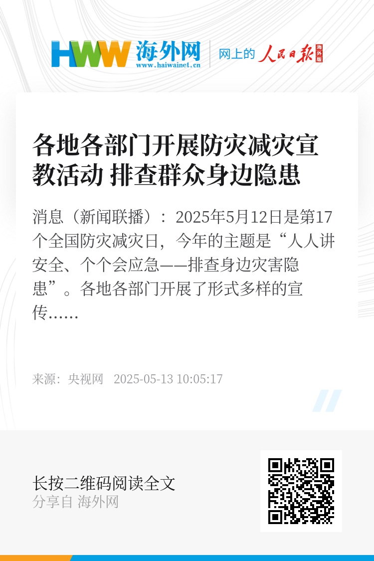 央视网消息(新闻联播):2025年5月12日是第17个全国防灾减灾日,今年的主题是“人人讲安全、个个会应急——排查身边灾害隐患”。各地各部门开展了形式多样的宣传教育活动。