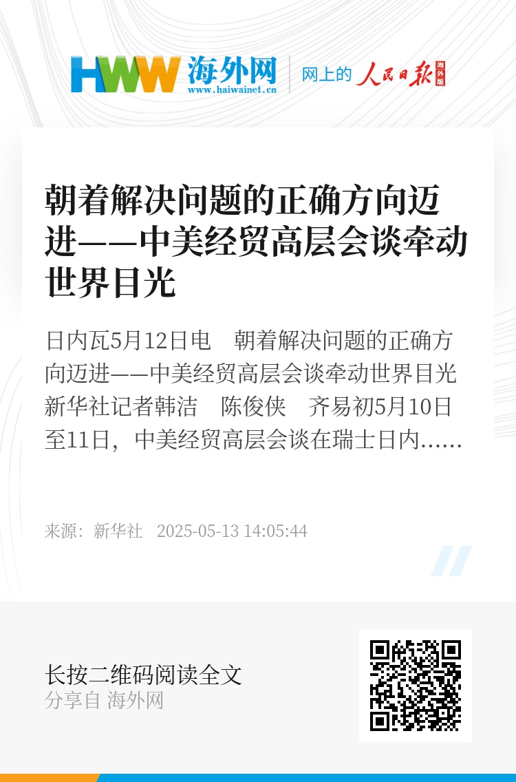 新华社日内瓦5月12日电 朝着解决问题的正确方向迈进——中美经贸高层会谈牵动世界目光