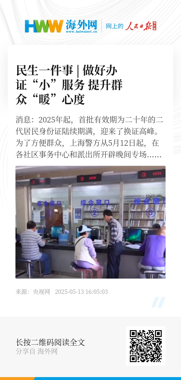 央视网消息:2025年起,首批有效期为二十年的二代居民身份证陆续期满,迎来了换证高峰。为了方便群众,上海警方从5月12日起,在各社区事务中心和派出所开辟晚间专场,给上班族办理居民身份证。同时,针对5大类16小项高频、易办的户政业务进行试点进社区服务。