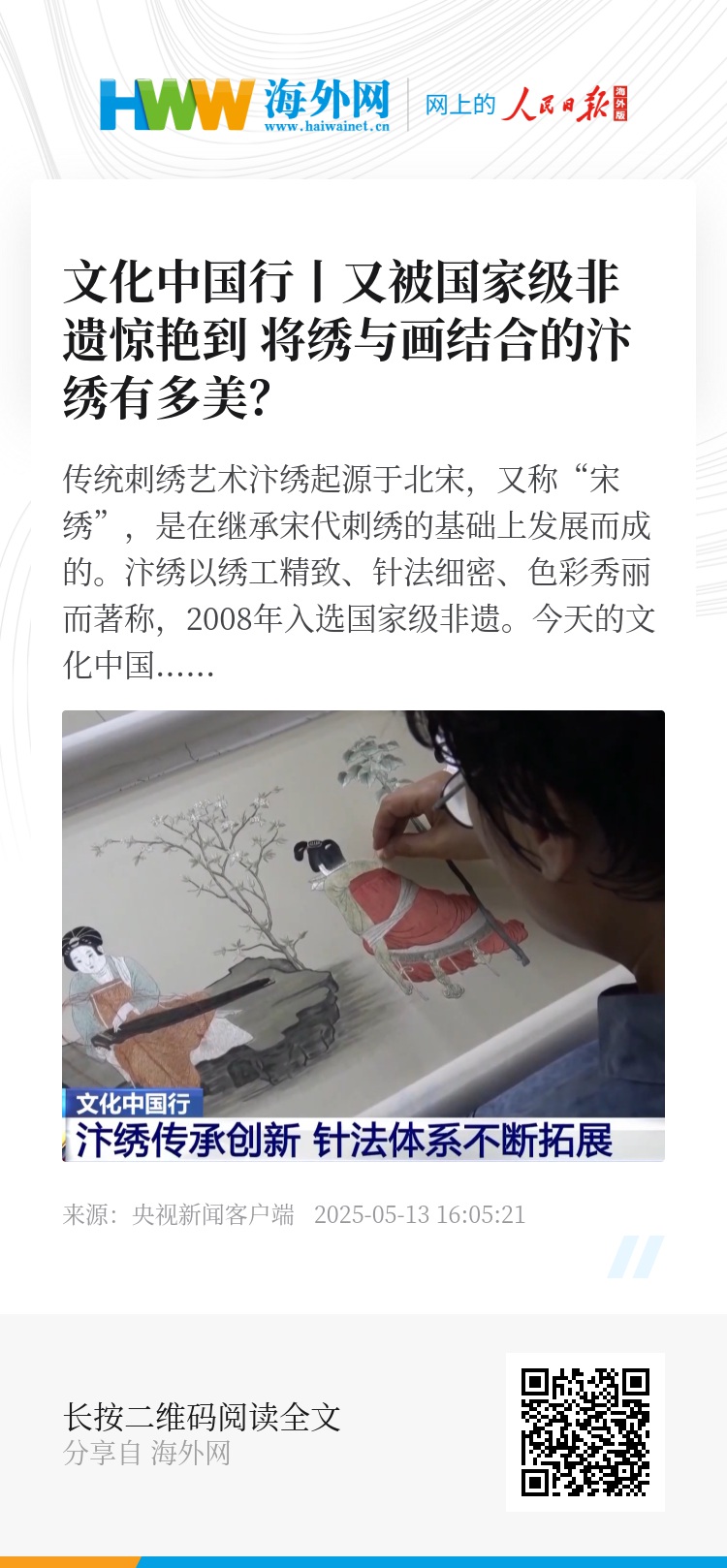 传统刺绣艺术汴绣起源于北宋,又称“宋绣”,是在继承宋代刺绣的基础上发展而成的。汴绣以绣工精致、针法细密、色彩秀丽而著称,2008年入选国家级非遗。今天的文化中国行,我们走进河南开封,去了解汴绣的艺术魅力和现代创新与发展。