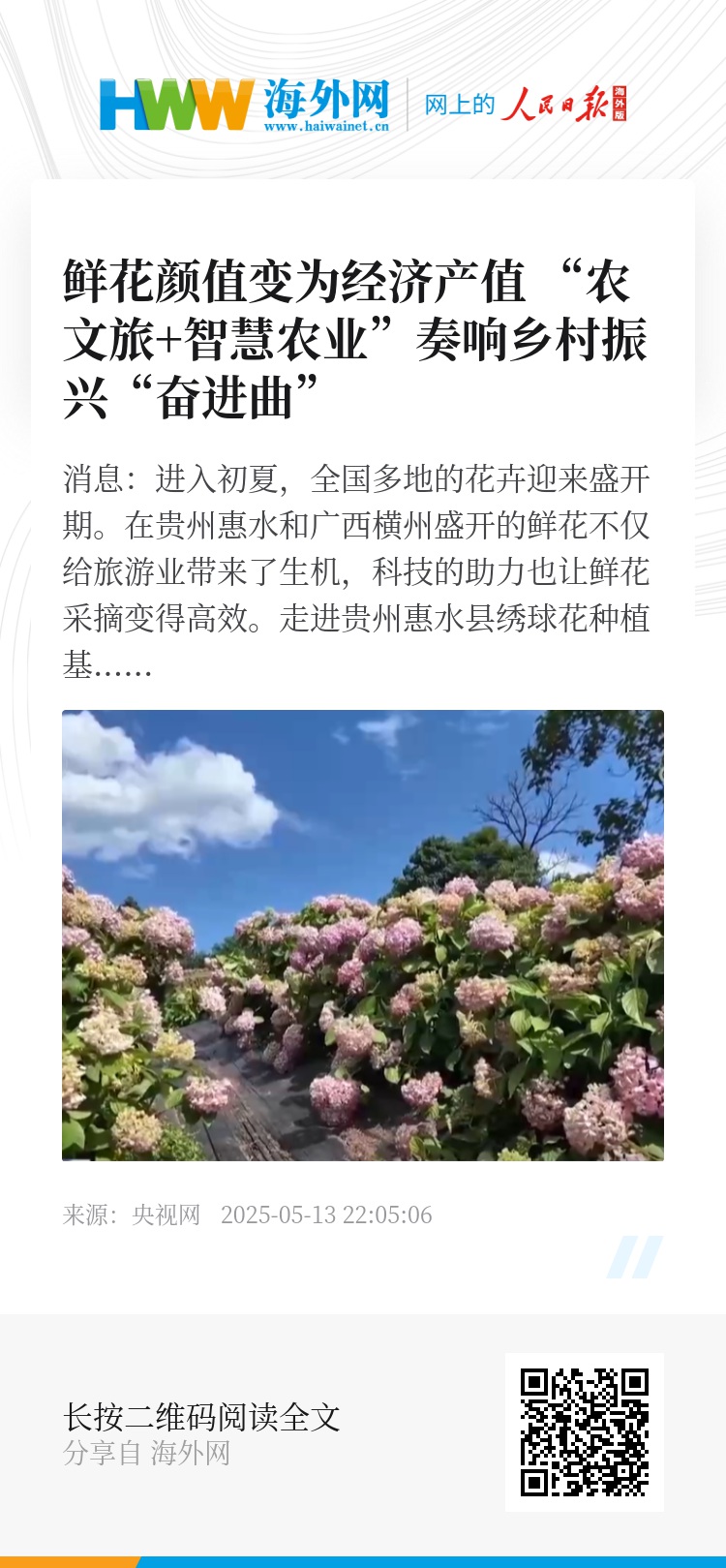 据了解,近年来惠水县大力发展花卉电商产业,搭建线上销售平台,目前绣球花日均销售额可达80万元。绣球花产业的发展也为周边村民提供了就业机会。