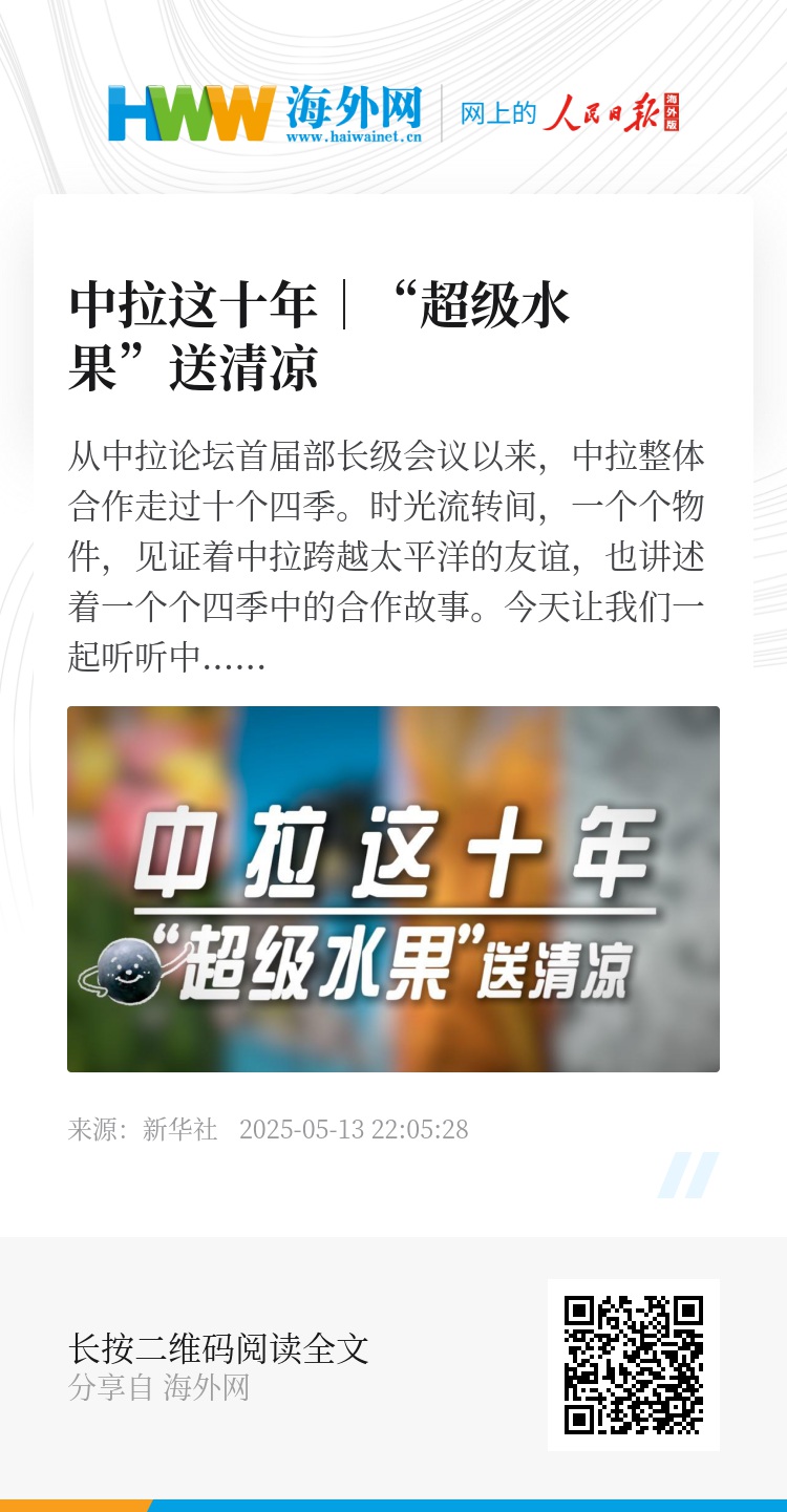 从中拉论坛首届部长级会议以来,中拉整体合作走过十个四季。时光流转间,一个个物件,见证着中拉跨越太平洋的友谊,也讲述着一个个四季中的合作故事。今天让我们一起听听中拉合作的夏季“物”语。