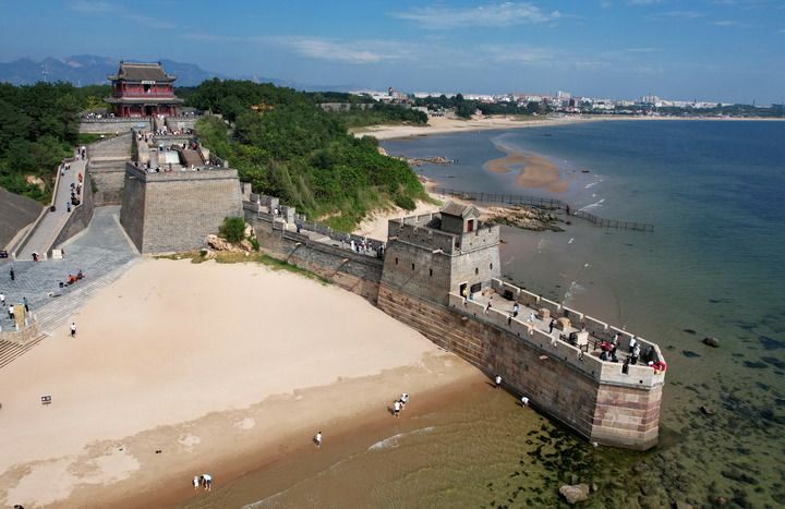 2024年9月19日,游客在秦皇岛市山海关区老龙头景区游览(无人机照片)。新华社记者 杨世尧 摄