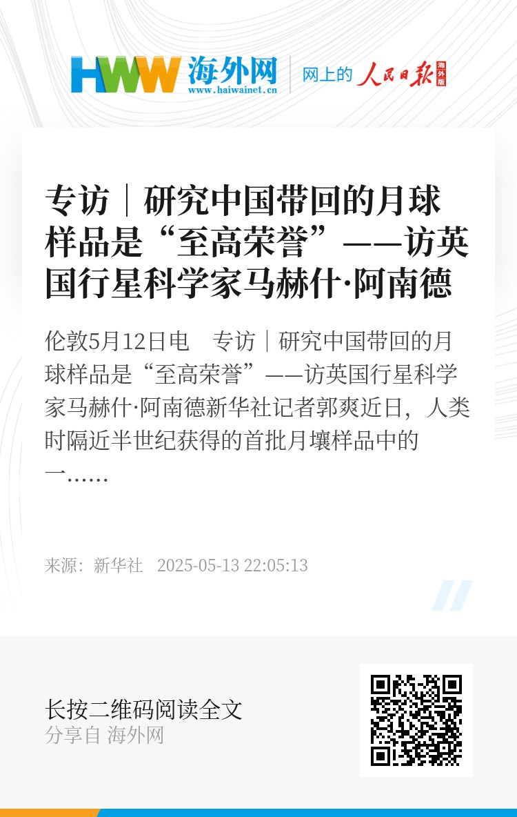 作为获准借用中国嫦娥五号带回月壤样品的英国科学家,阿南德日前接受新华社记者专访时说,能使用这一宝贵样品开展科学研究是一种“至高荣誉”,他期待国际科学界继续加强科研合作。