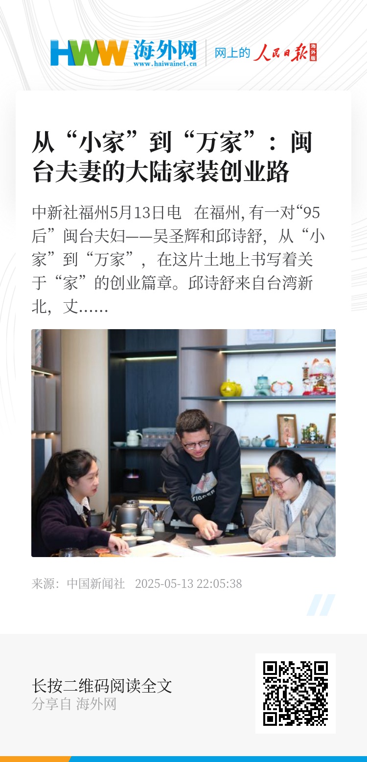 中新社福州5月13日电 在福州,有一对“95后”闽台夫妇——吴圣辉和邱诗舒,从“小家”到“万家”,在这片土地上书写着关于“家”的创业篇章。