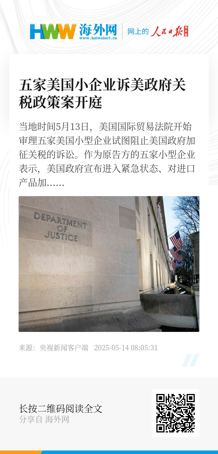 美国司法部则表示,只有美国国会可以对美国总统宣布国家紧急状态提出质疑,本案原告尚未受到关税政策的损害,因此要求法院驳回诉讼。美国国际贸易法院预计将在未来几周内发布书面判决。(央视记者 曹健)